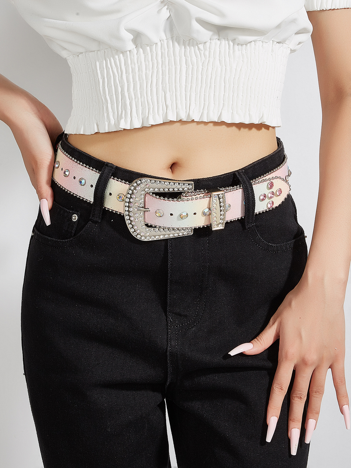 Color: two-piece rhinestone beaded white, two-piece rhinestone beaded rainbow color
