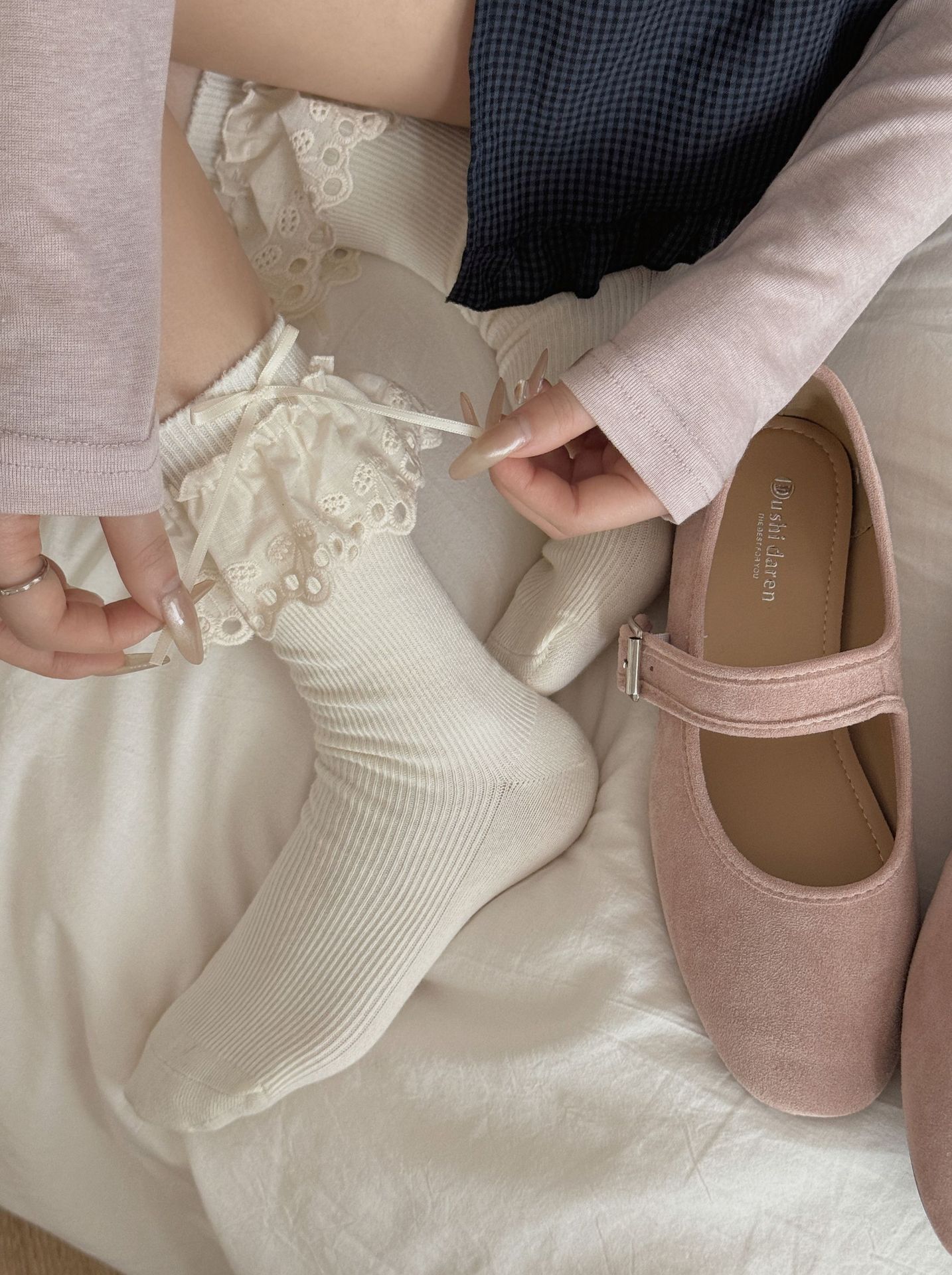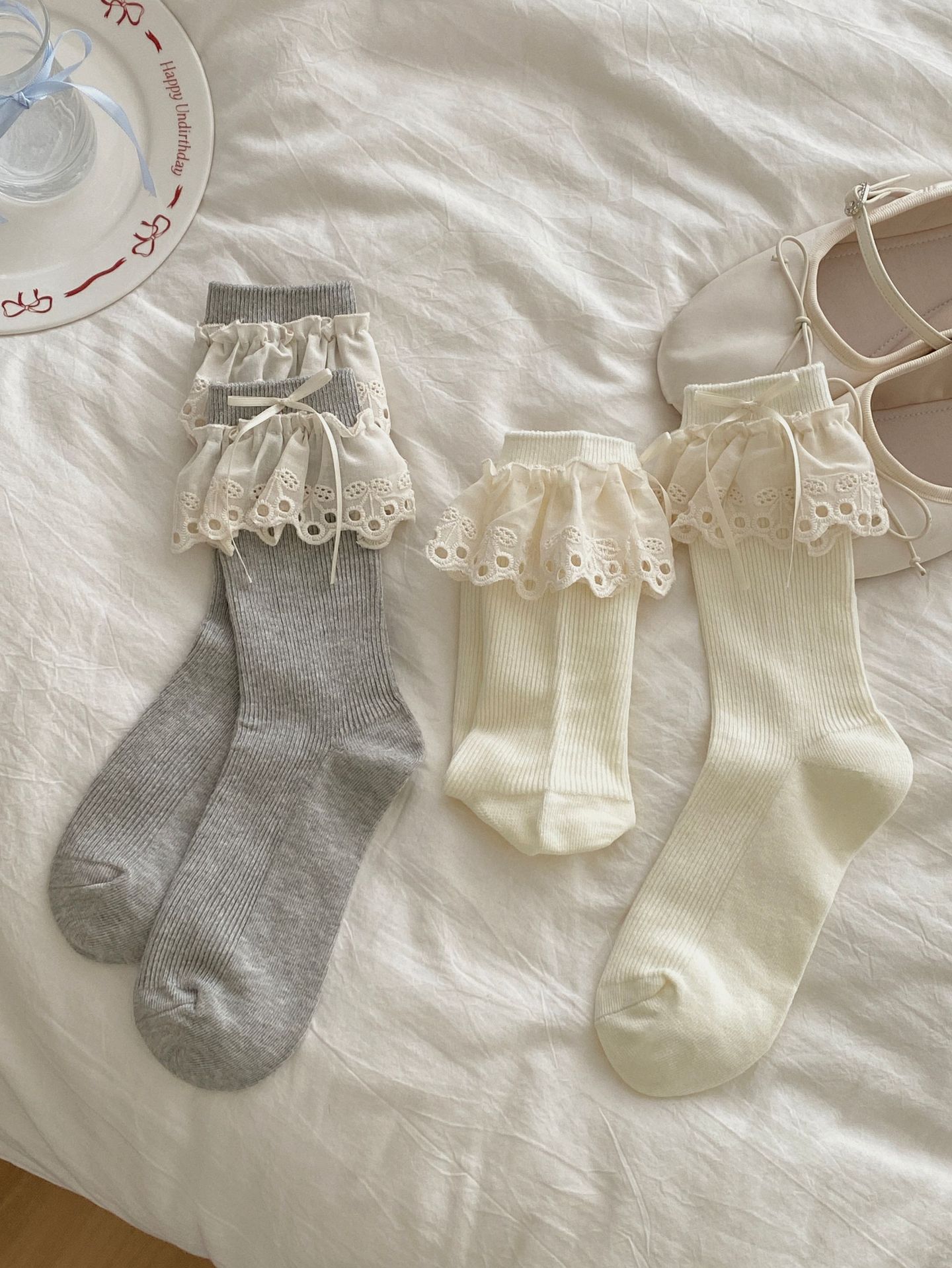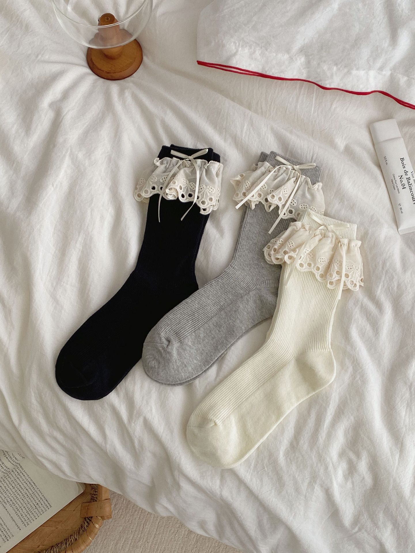 Ins Ballet Style Blogger Same Style Tube Socks Hollow Cherry Lace Bow Socks Japanese JK Girl Bunching Socks