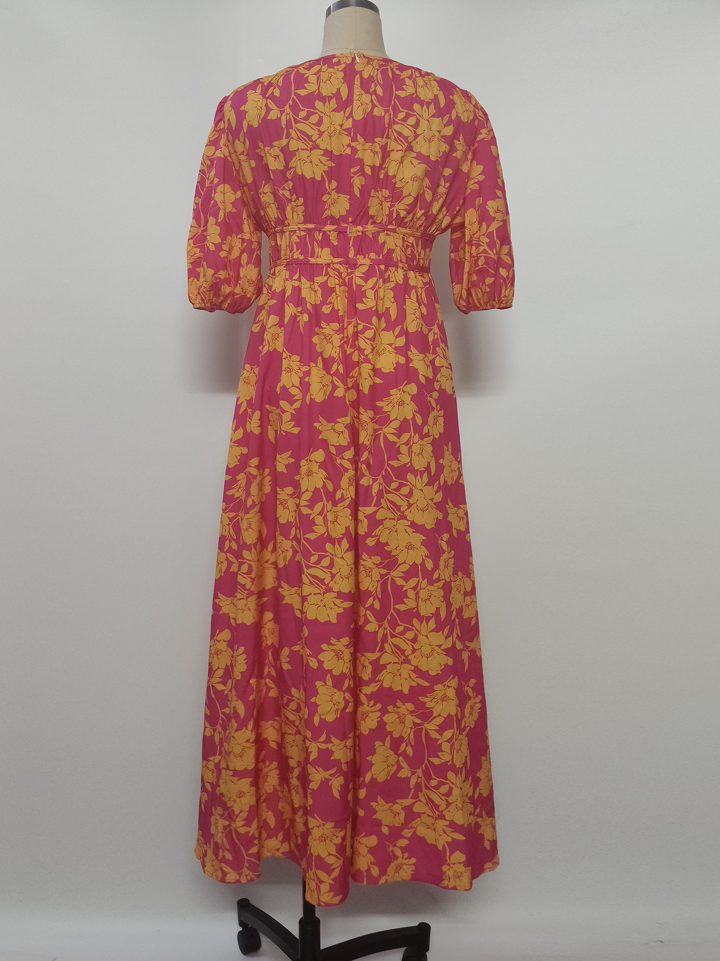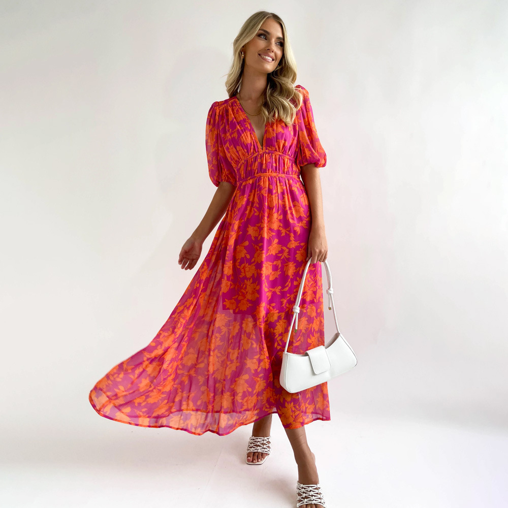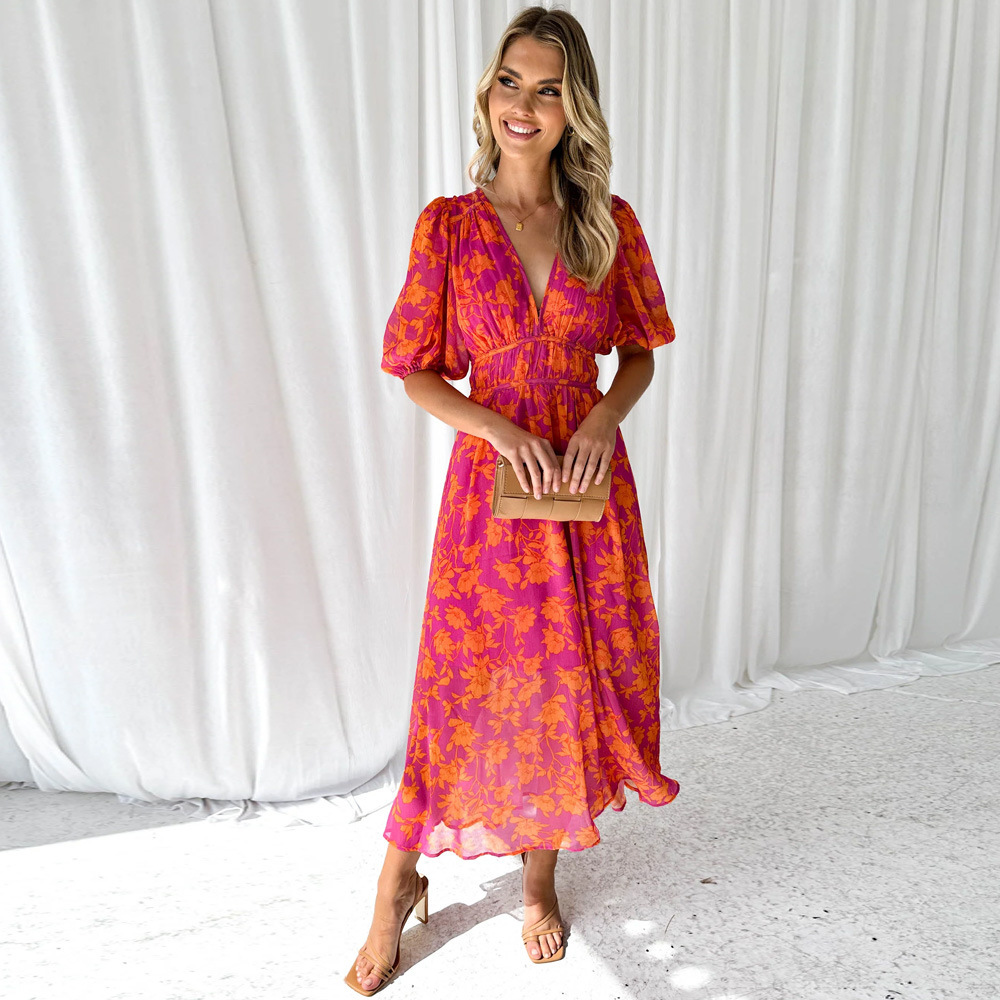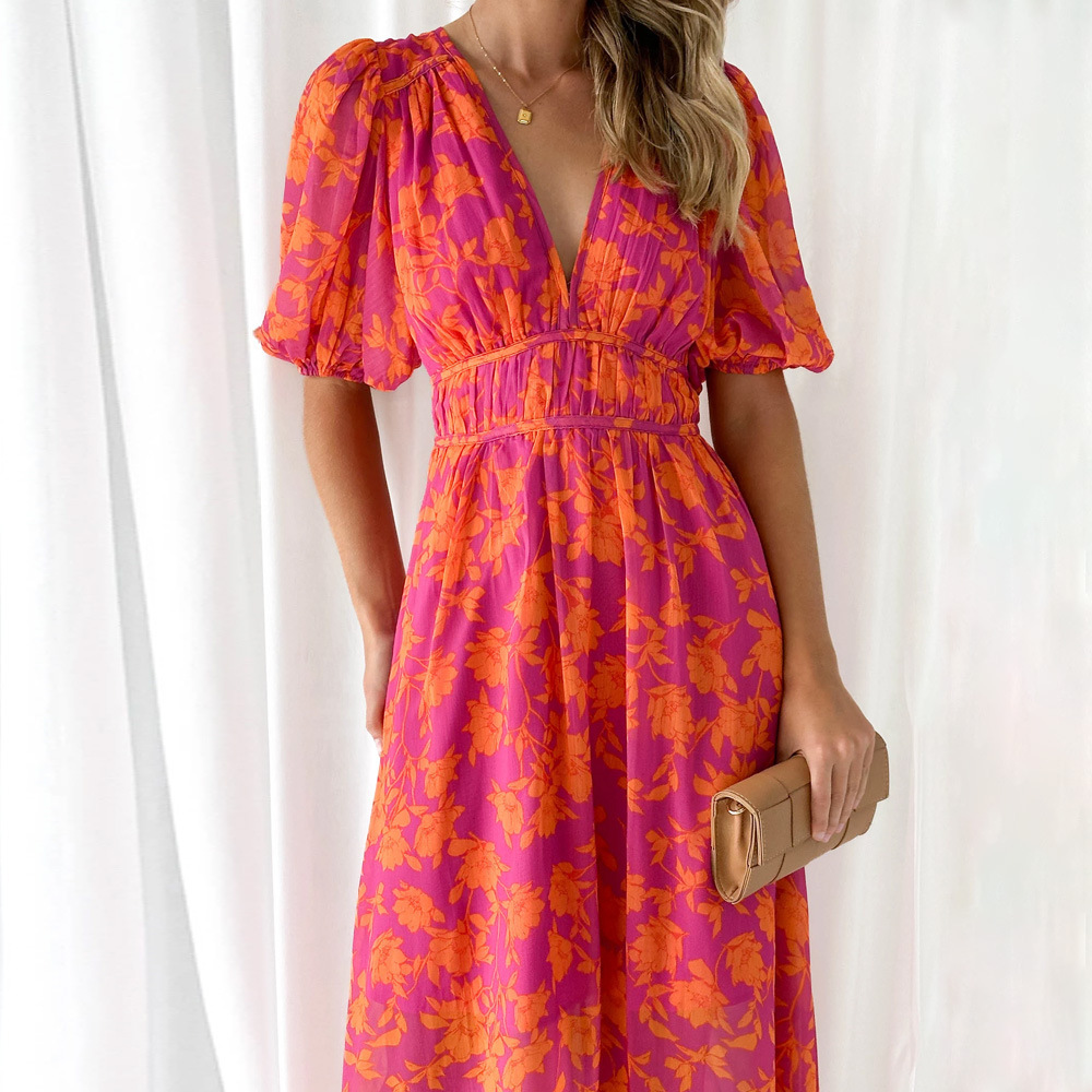 Summer Printed V-neck Sexy Waist Trimming Dress