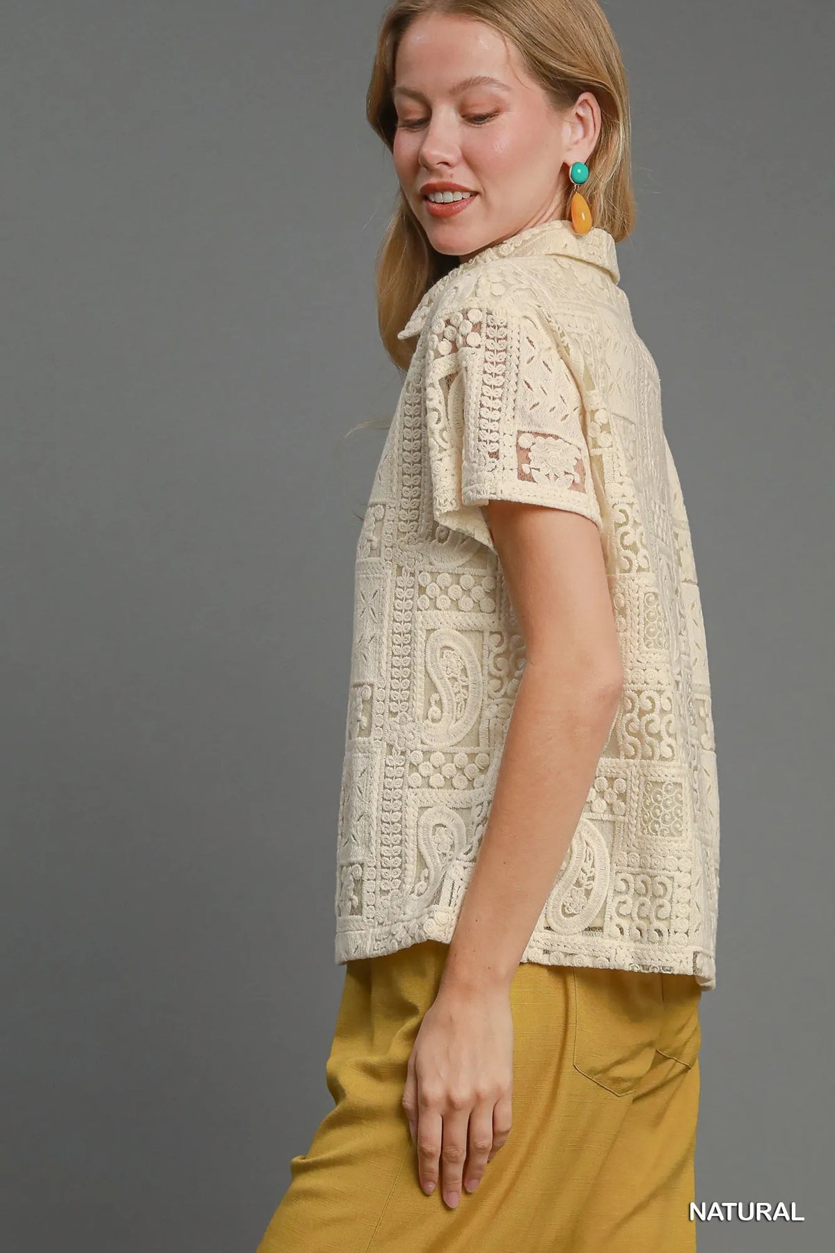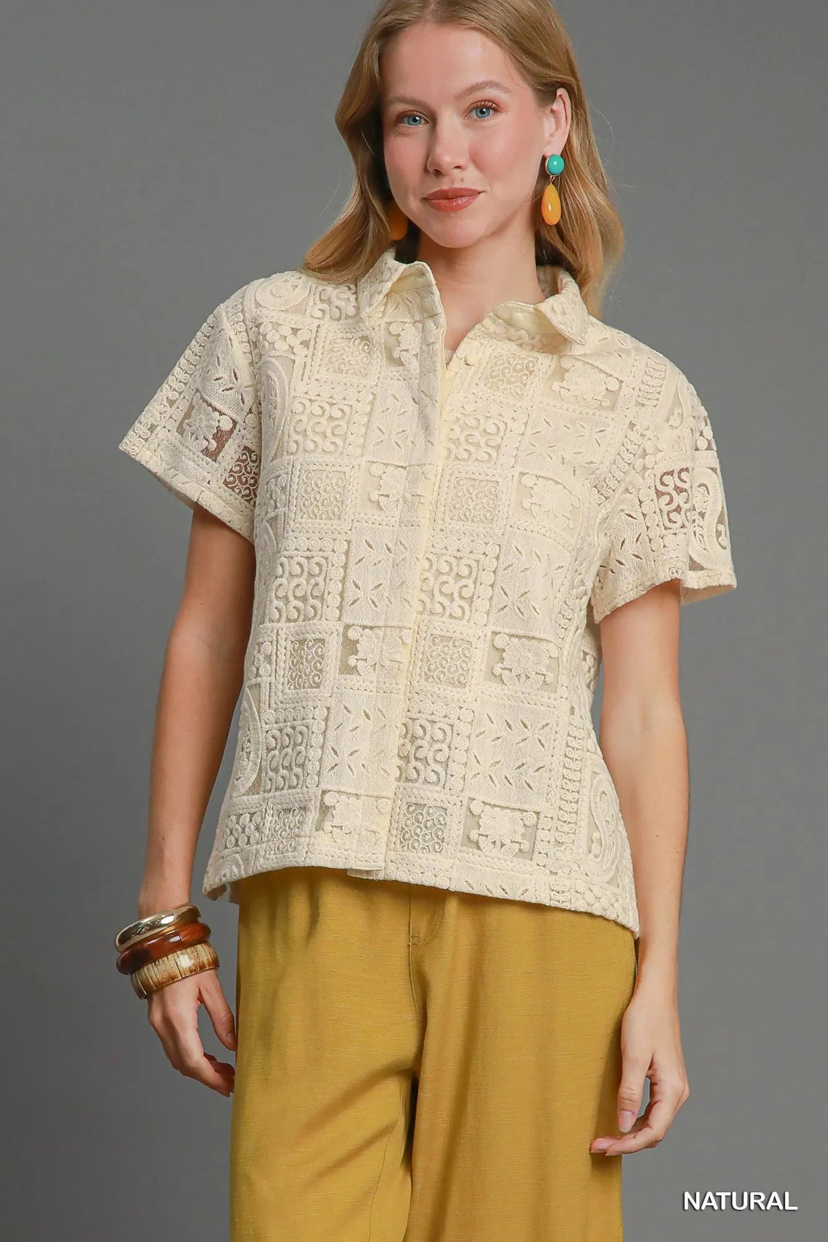 This patch lace short sleeve button down shirt combines feminine details with a classic silhouette. The lace patches add a delicate touch to this versatile piece. Perfect for adding a touch of elegance to your everyday wardrobe. Pair with jeans or a skirt for a stylish and polished look.