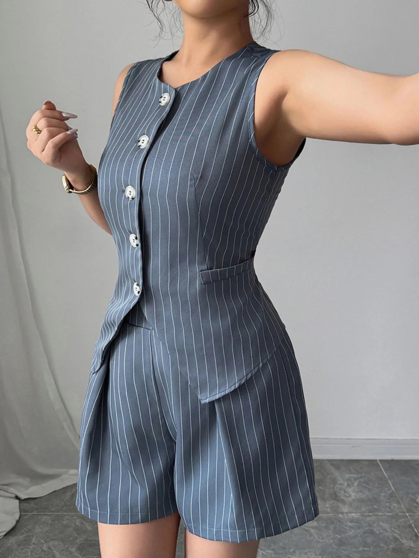 Striped Button Up Vest and Shorts Set