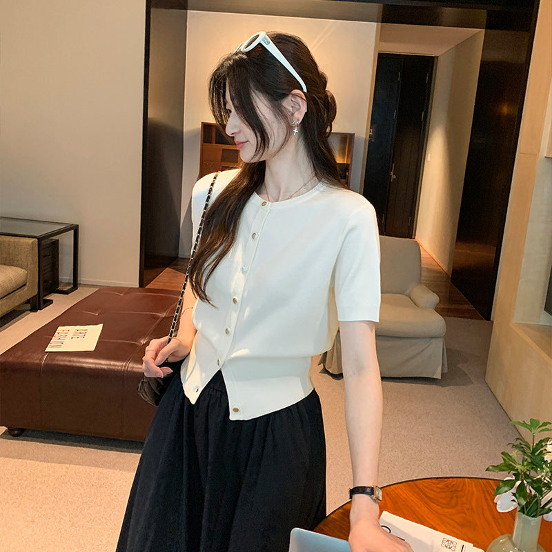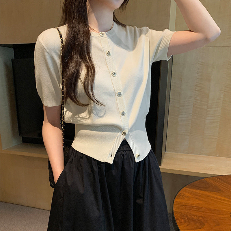 French Style Unique Temperament Crew Neck Short Sleeve Knitted Cardigan