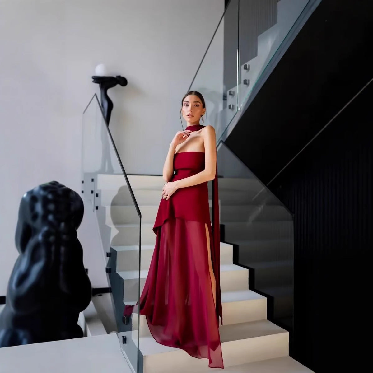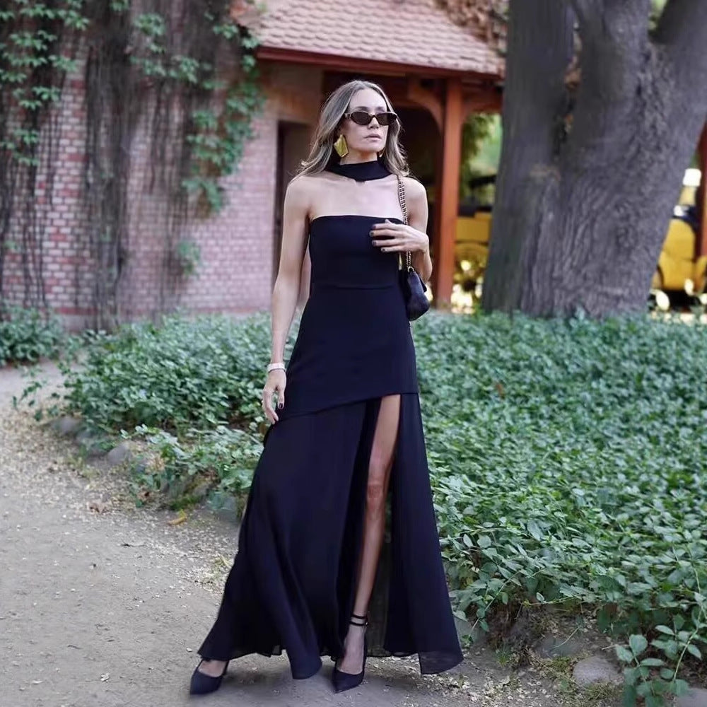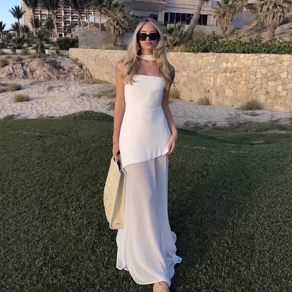 Women's Clothing Tube Top Mesh Splicing Hem Dress Sexy Solid Color