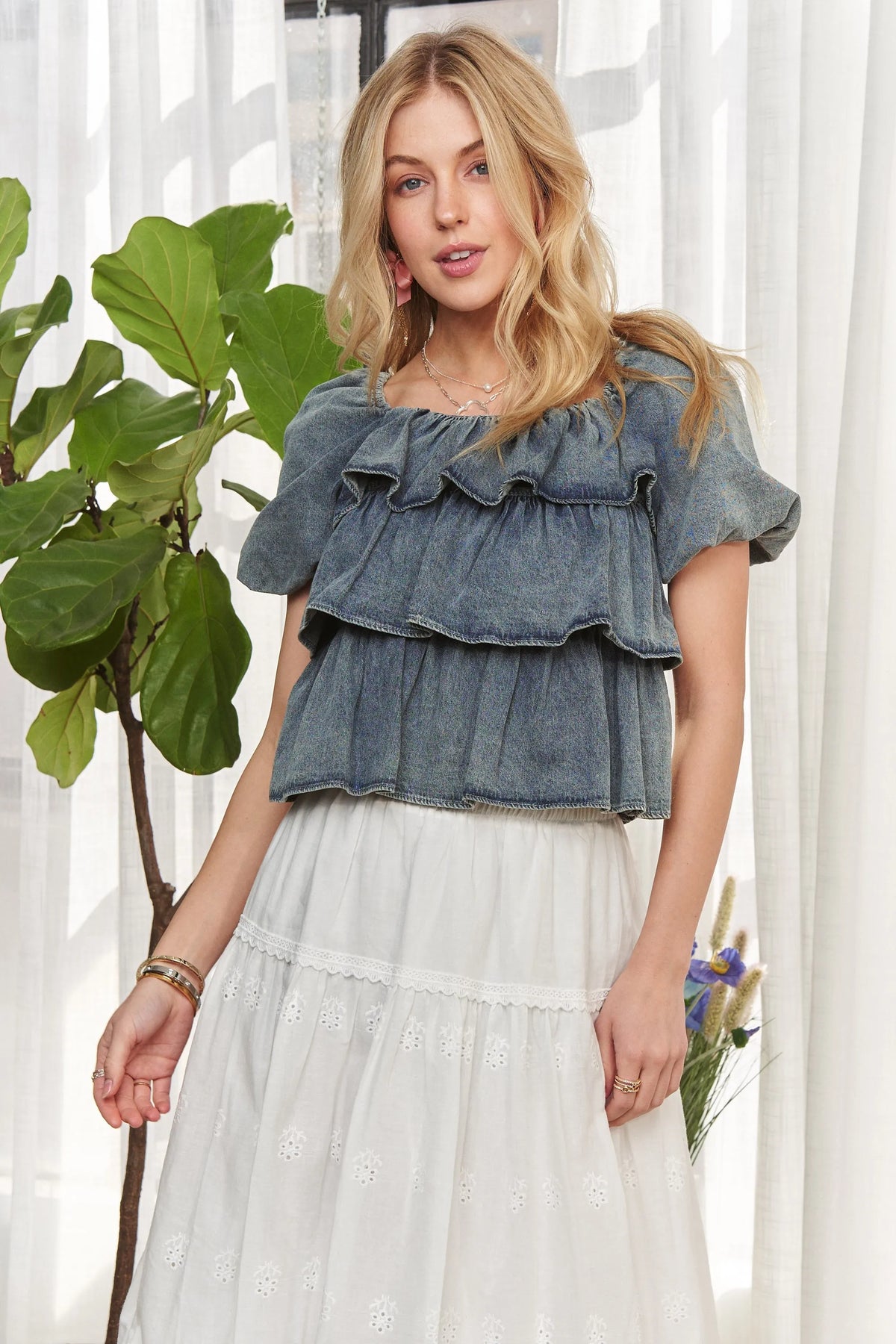 The Washed Denim Layered Ruffle Blouse elevates the classic denim look with a stylish and feminine touch of layered ruffles. The washed denim fabric offers a casual yet chic vibe, perfect for a trendy and versatile outfit. Pair this blouse with jeans for a double denim look or with a skirt for a playful and fashion-forward ensemble.