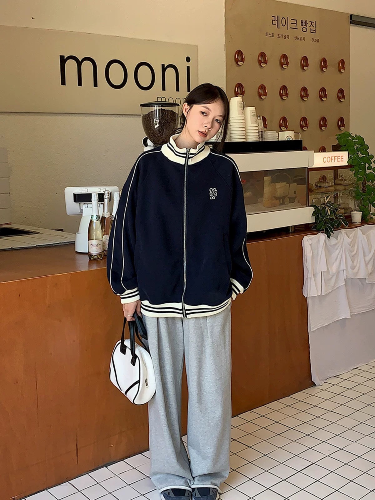 Contrast Color Striped Stand Collar Loose Preppy Style Leisure Sports Sweater Coat