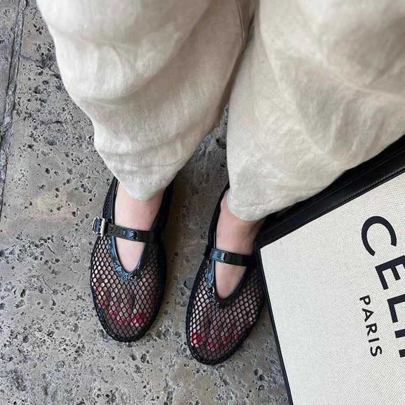 Chic Round Cowhide with Mesh Detail Ballet Shoes
