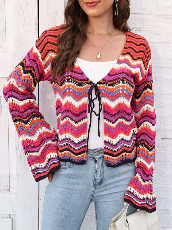 Rainbow Wave Woven Cardigan Sweater with Monochrome Stripes