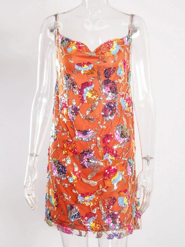 Sexy boat neck backless sequin floral chain women's sexy short dress