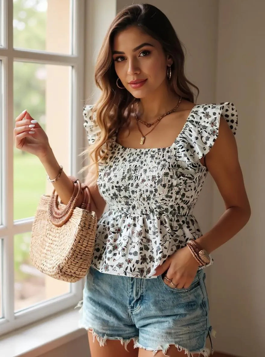 Smocked Square Neck Ruffled Cap Sleeve Blouse