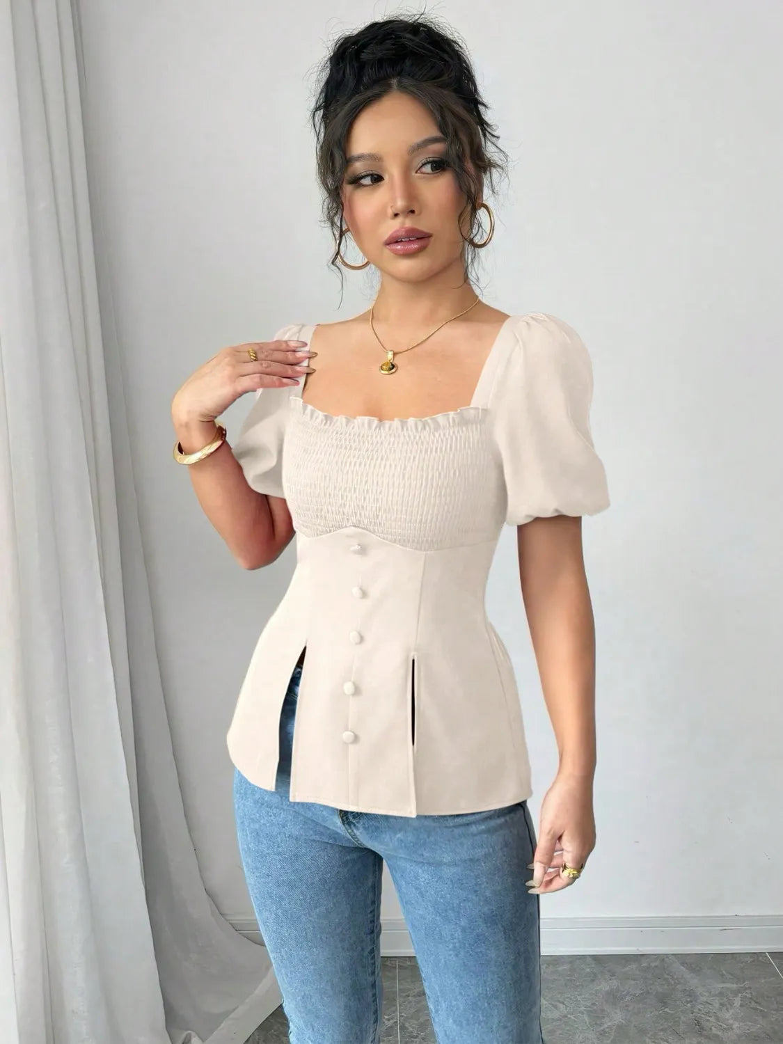• Features: Smocked, Tied, Decorative Button, Slit, Frill