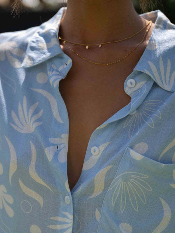 Women's Lapel Printed Sleeve Top Shorts Fashion Two-Piece Set
